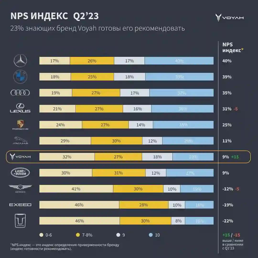 В первом полугодии 2023 года2 люксовый бренд VOYAH стал лидером по росту индекса NPS — увеличение готовности рекомендовать к покупке продукцию люксового бренда VOYAH составило 15 процентных пунктов при уровне значимости 95%. В то время как другие игроки анализируемого сегмента продемонстрировали стагнацию или падение. По итогам второго квартала 2023 года NPS-индекс составил 9%, что позволило бренду, меньше чем за год присутствия на российском рынке, превзойти показатели ряда грандов мирового автопрома, включая известные премиальные марки с вековой историей. Более того, результаты некоторых из них даже не смогли достичь положительного значения. Эксперты рассчитывали индекс NPS среди потребителей, знающих марку, как разницу между теми, кто готов или не готов рекомендовать ее модели к покупке. Таким образом, в настоящий момент показатель позитивного отношения к VOYAH находится на уровне выше среднего.