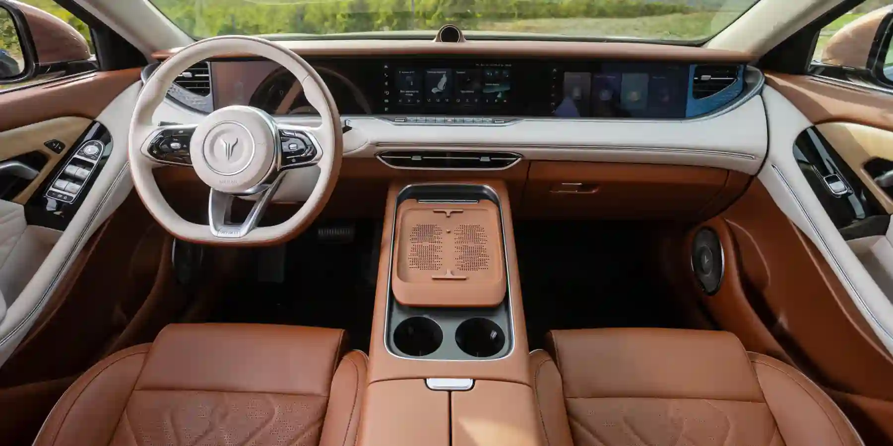 Среди ключевых элементов интерьера, как заявляет производитель, первая в мире подъемная панель приборов с тремя интегрированными 12,3'' дисплеями и «штурманский» экран. А подсветку салона можно выбрать из 64 вариантов.