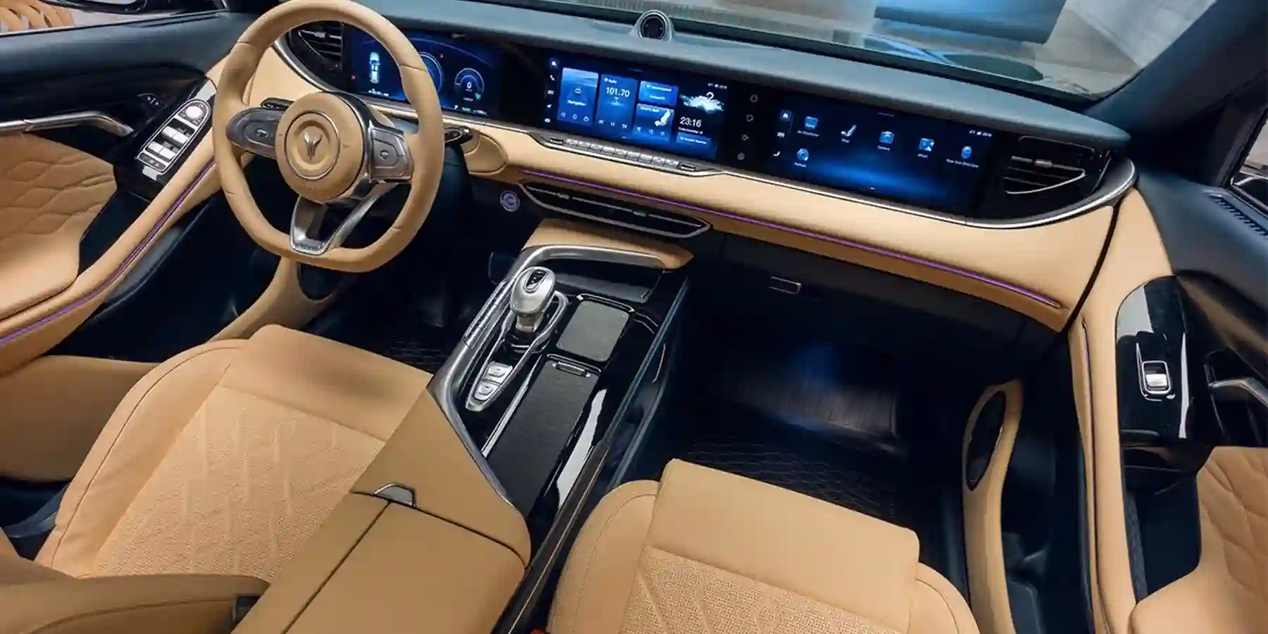 В передней части салона установлено три монитора — диагональю 12,3 дюйма каждый. Интерьер полностью обшит кожей, в том числе передняя панель и дверные карты. Всего доступно три варианта отделки: бежевый с тёмно-синим (как на фотографиях), чёрный с тёмно-синим и коричнево-красный с акцентами цвета слоновой кости.
